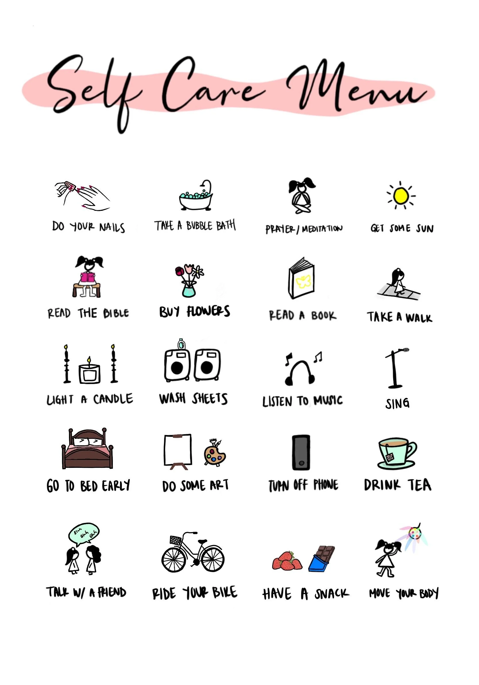 I hope these tips help you on your journey to being the best version of yourself. Here’s a little self-care menu from our upcoming book, The Butterfly Key, to help you pick something to do when you need some ideas!