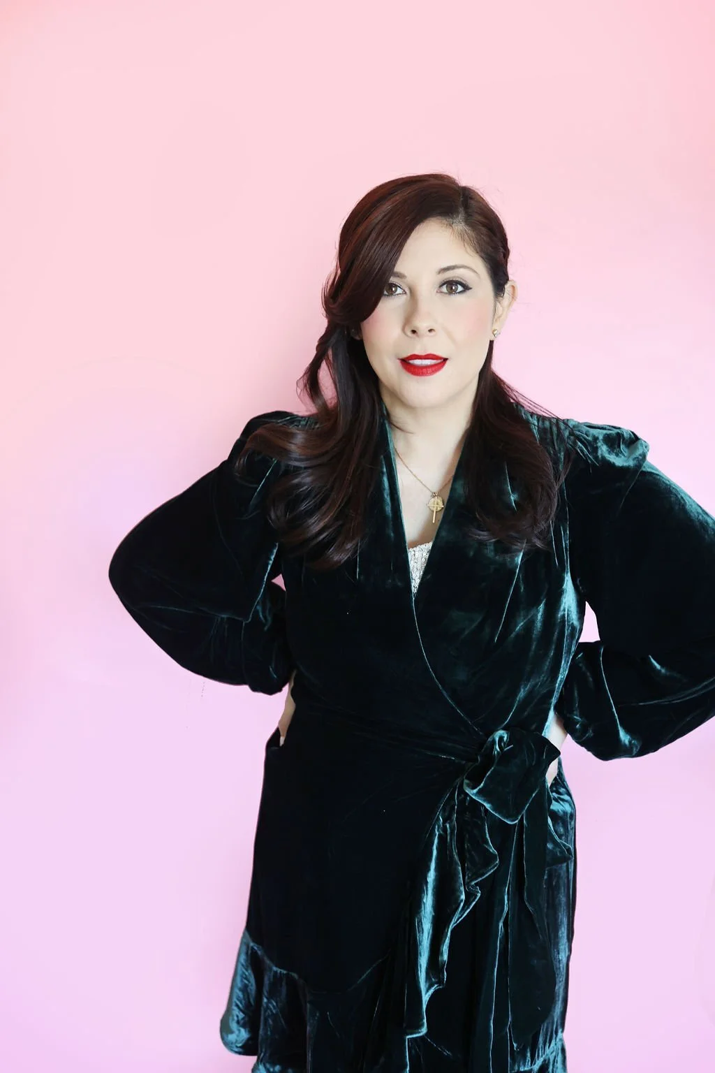 This is one of my favorite shades of red for the Holiday Season, especially when paired with a gorgeous green velvet dress like this one!