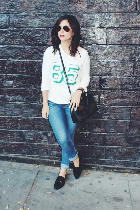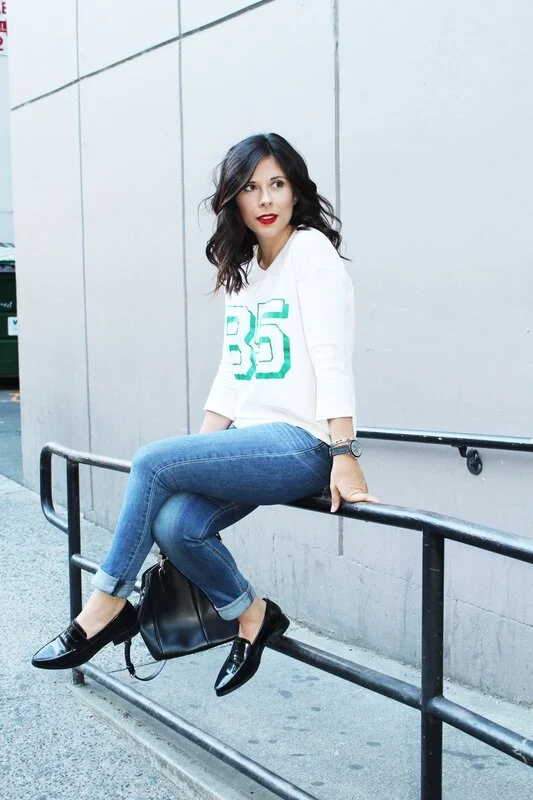I love to do a casual pullover with skinny jeans and dress it up with some snazzy flats and a bold red lip! So casual, simple yet effective!