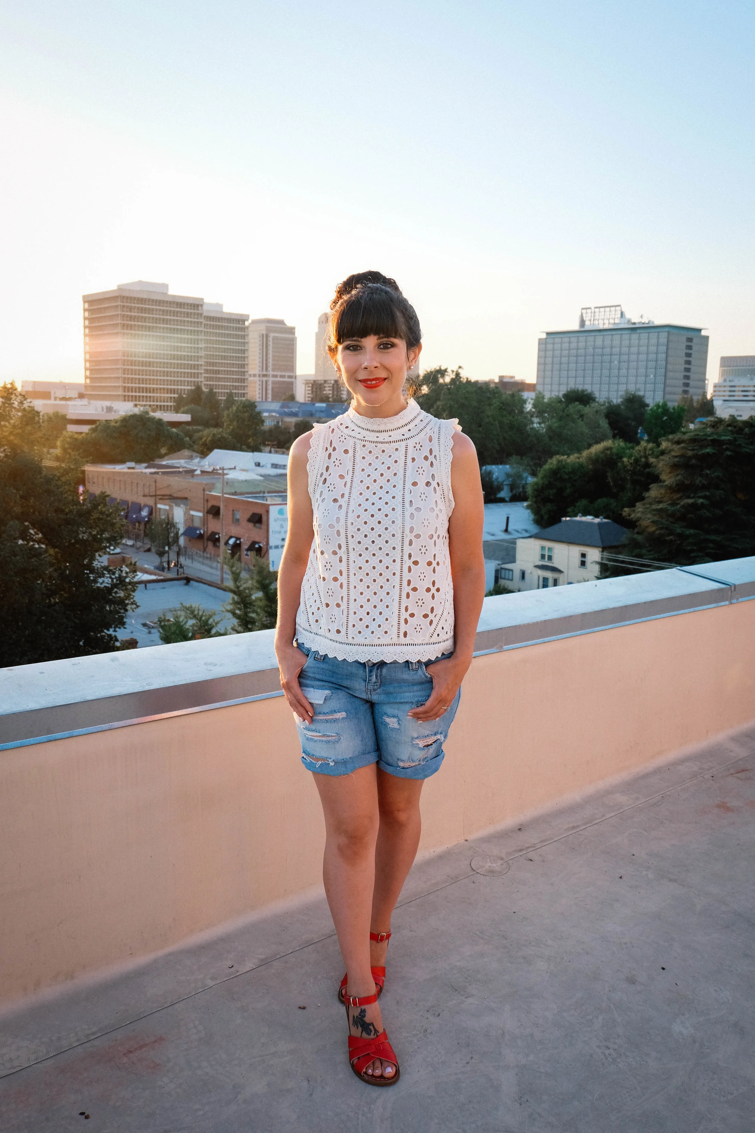 OUTFIT #3 | White Eyelet Blouse / Distressed Shorts / Red Saltwater Sandals