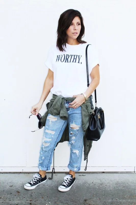 I love Spring because you get to wear your winter pieces a little differently! I took my military jacket and instead of wearing it on me, I tied it around my waist. I think it looks super cute. I feel comfy when I put anything around my waist and it makes me feel hip! I don't know if I actually am hip or not, but that's not up for discussion! I loved pairing a simple tee shirt with tattered jeans and some trusty ol' converse. This look is my ultimate favorite when I have a ton of errands to run and I want to feel cute but need comfort and can be ready to run from anyone or toward anyone, you feel me?