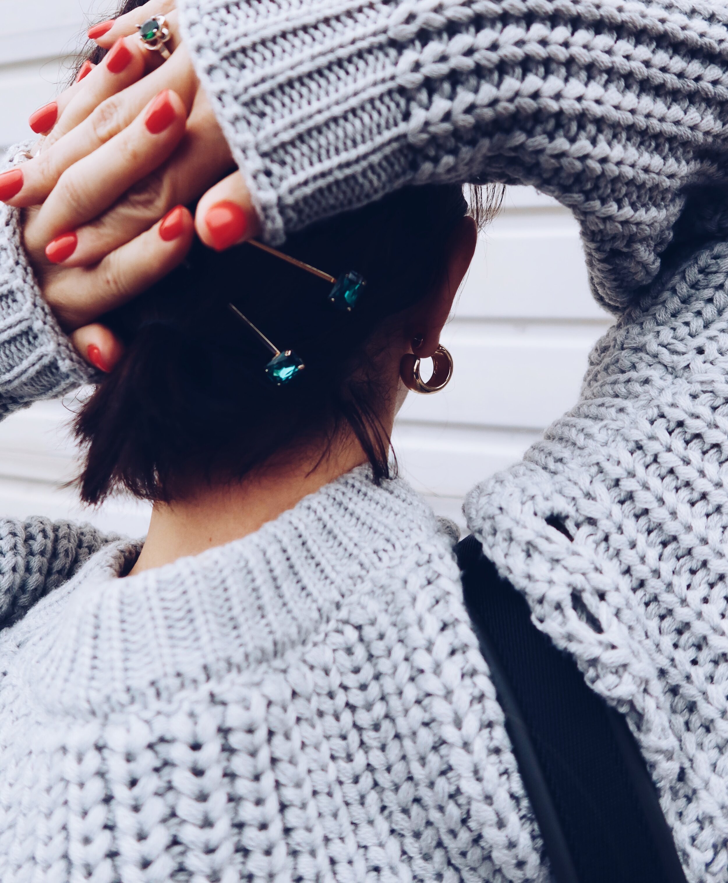 Friends! This skirt color is sooooooo good! I first saw it on Meghan Markle as I researched a Fashion Editorial I got hired for this summer. She had this emerald green color skirt on, only in a leather material, I just fell in love with her look, so I put an emerald green satin skirt on my shop list. I waited for the Madewell sale to happen to buy it! Got it 30% during Black Friday. This weekend I knew I wanted to style it in a casual-cozy sort of way that still gave me Christmas Party Vibes! So I added a chunky gray knit. I love seeing the textures in Glorious Symphony! The sweater I linked is similar to what I’m wearing because what I have on, is not available online, just FYI