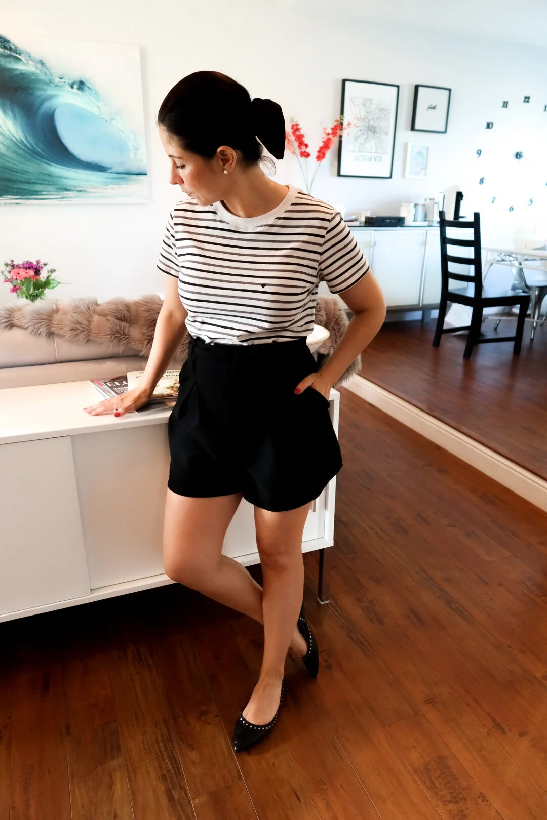 I love this so much. This little striped black and white number is something I will wear so much!! The fit is beautiful and it just goes with pretty much everything. I really enjoy having this little heart on the side. It’s an added cutie pie bonus! For your reference, I am 5” 1’ and wearing a size XS in these shirts.