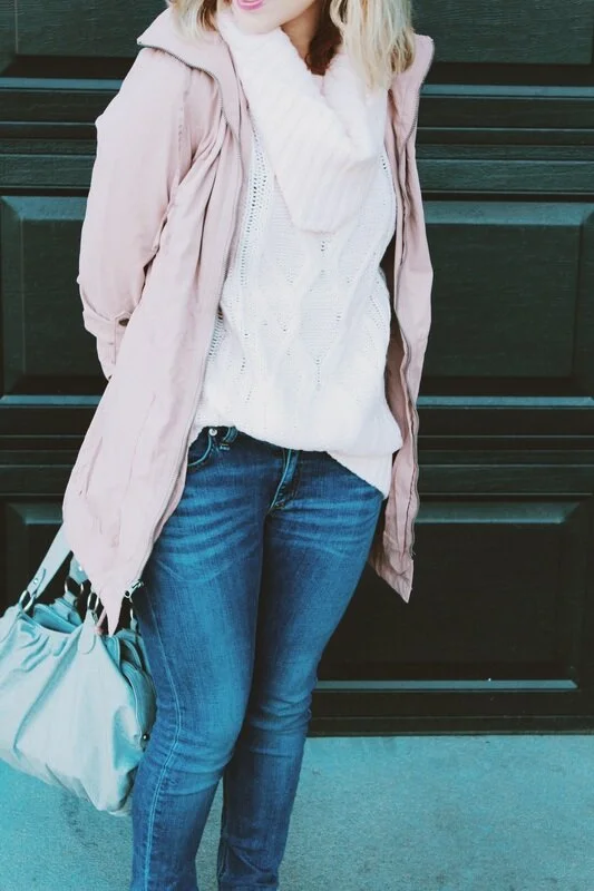 Pink Turtleneck Chunky Knit Sweater: (HERE)